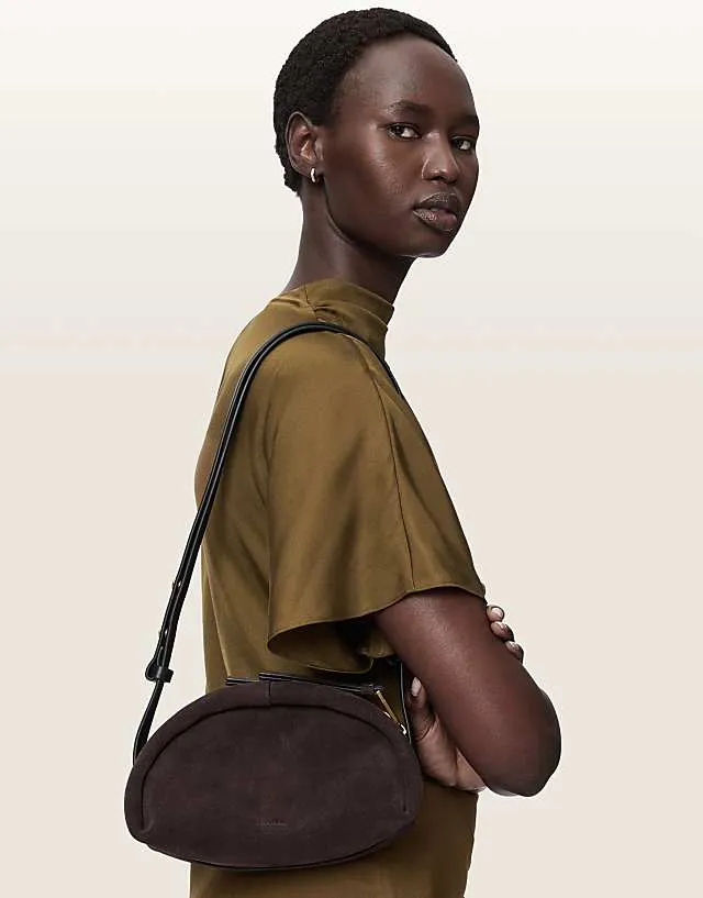 A dark brown suede leather crossbody bag by AllSaints. Features a stylish arc shape and high-quality suede finish.