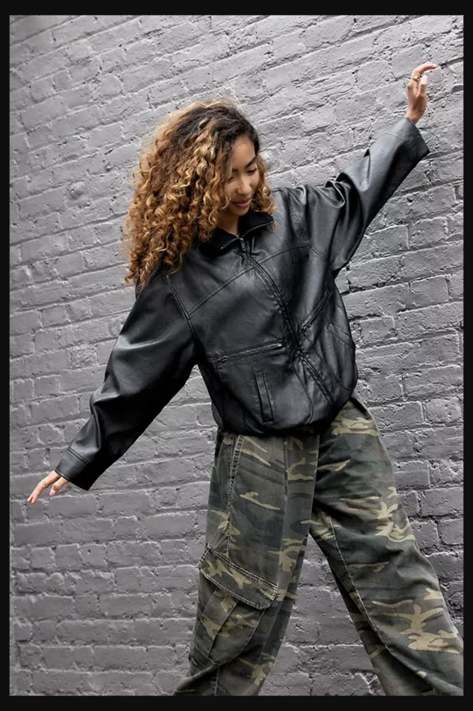BDG bomber jacket with a relaxed fit, crafted from black faux leather. Timeless style featuring a corduroy collar, front zip fastening, long sleeves, multiple pockets and an elasticated hem.