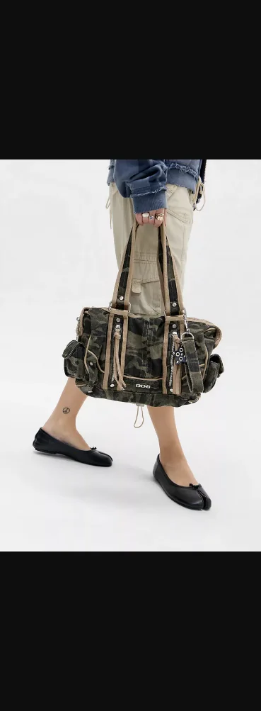 Utility-style bag from BDG topped with a camo print design. Crafted from cotton canvas with contrasting trims, two flat shoulder straps, a top zip fastening, multiple pockets and silver-tone hardware.