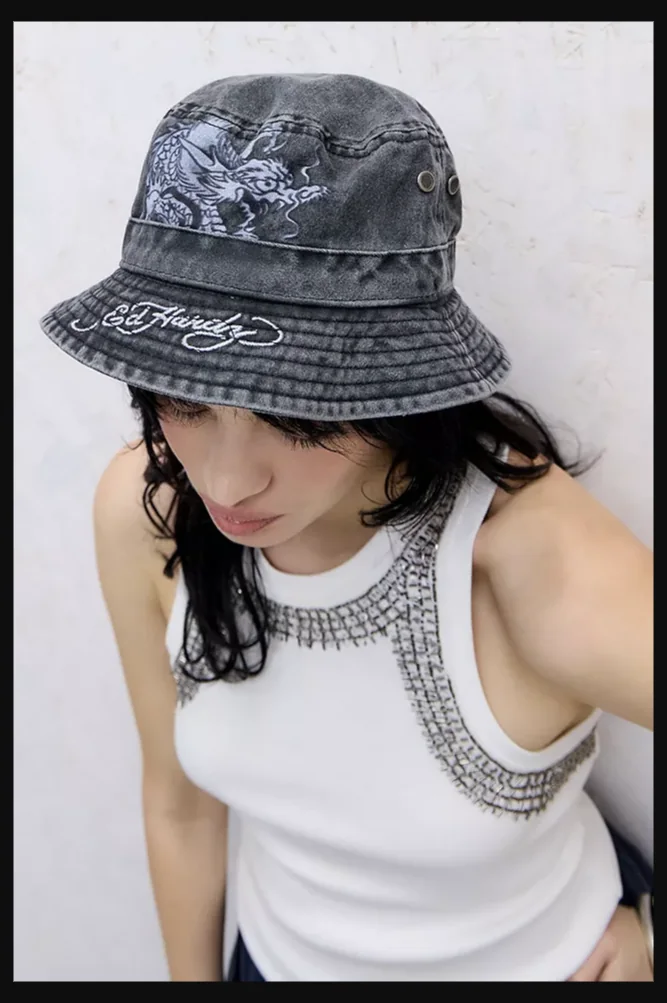 Edgy bucket hat featuring an embroidered crawling dragon graphic. Crafted from durable acid-wash cotton with an all-around brim for sun protection.