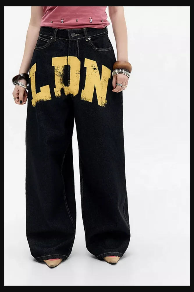 Original XL colossus fit jeans from Jaded London. Crafted from heavy non-stretch slub indigo fabric, complete with a yellow LDN print, a low-rise waist, belt loops, a button and fly fastening, classic five pockets and a baggy wide-leg fit.