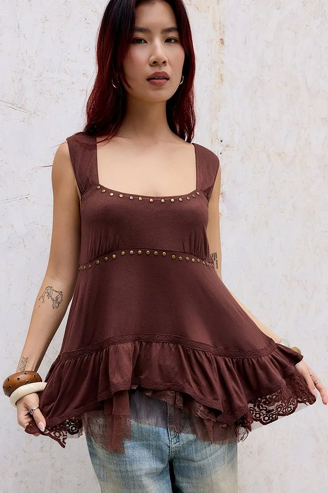 Floaty tank top by Kimchi Blue, crafted from soft jersey fabric. Complete with thick straps, a scoop neckline, stud embellishments and a tiered hem with lace and mesh detailing.