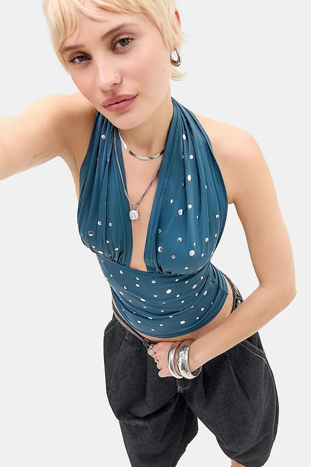 Flattering halter top from Lioness featuring sequin embellishments. Fitted style crafted from stretchy jersey, complete with an adjustable tied halter strap, plunging neckline, open back and cropped hem.