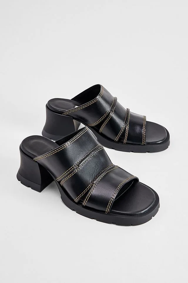 Heeled sandals from MIISTA. Triple black leather straps with contrast stitching sit on a volumised rubber sole. Ideal for day-to-night styling. Complete with an ultra-cushioned memory foam padded-stitch insole.