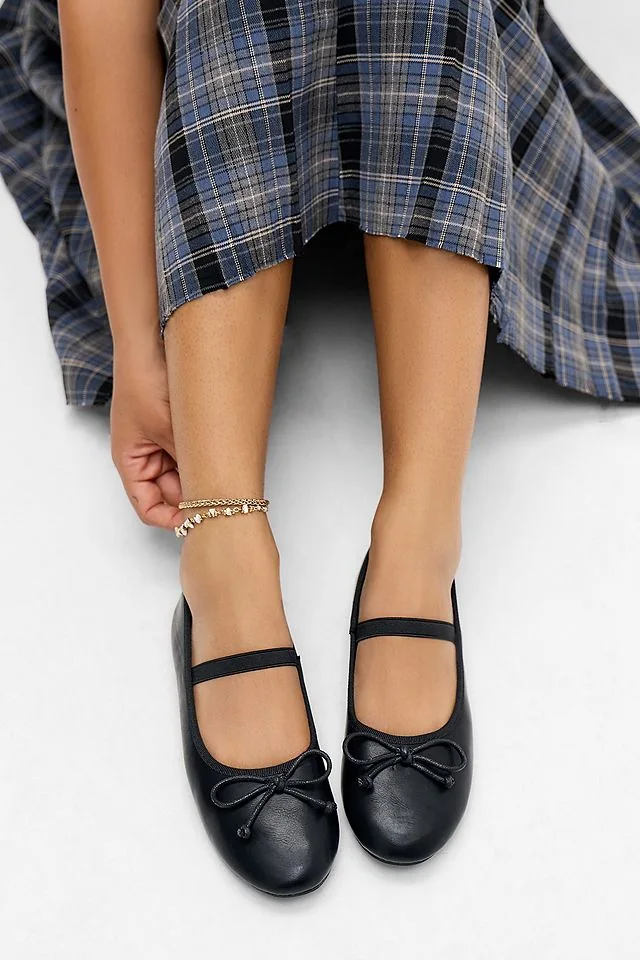 Black ballerina shoes from RAID, perfect for everyday wear. Classic silhouette with a faux leather upper, complete with a rounded toe, bow accent, elasticated strap and flat rubber sole.