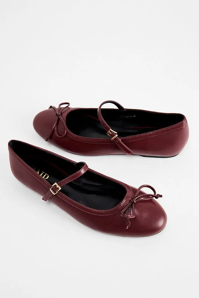 Burgundy ballerina shoes from RAID, perfect for everyday wear. Classic silhouette with a leather upper, complete with a rounded toe, bow accent, buckled strap and flat rubber sole.