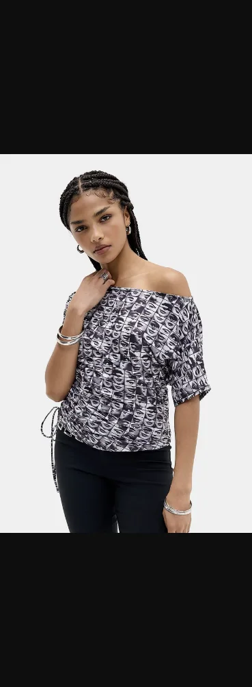 Graphic tee from Silence + Noise. Crafted from soft jersey complete with an asymmetric off-shoulder neckline, short sleeves and ruched detailing on the side.