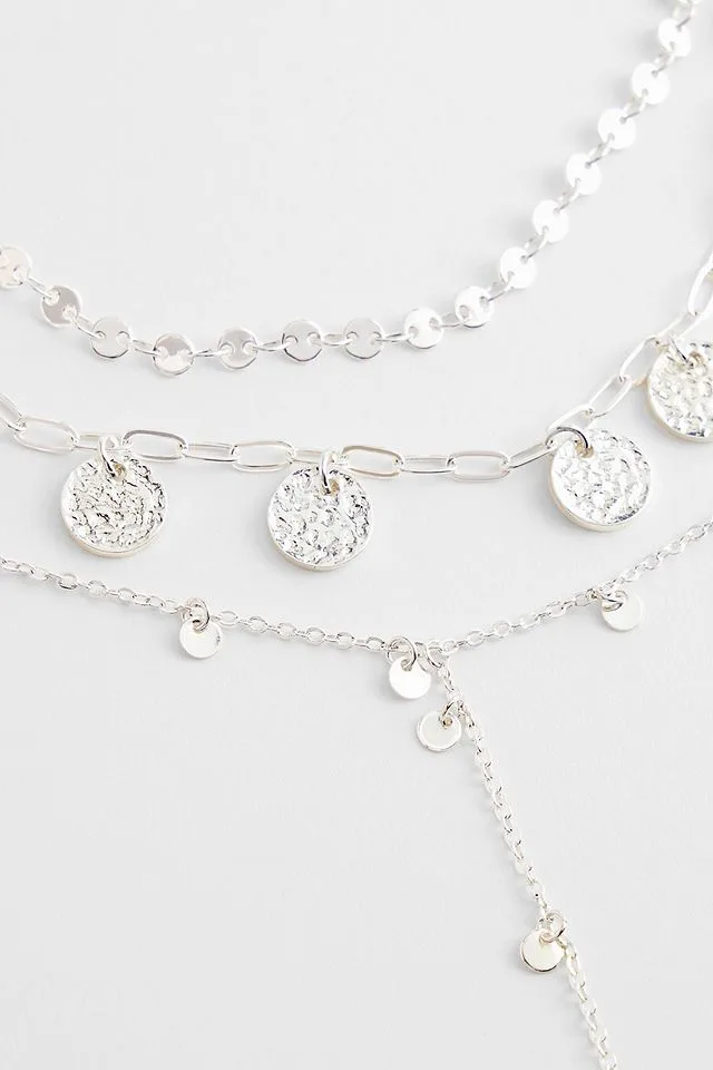 Accessorise your fit with this triple layer necklace from Silence + Noise. Features three delicate adjustable chains, adorned with circular charms.