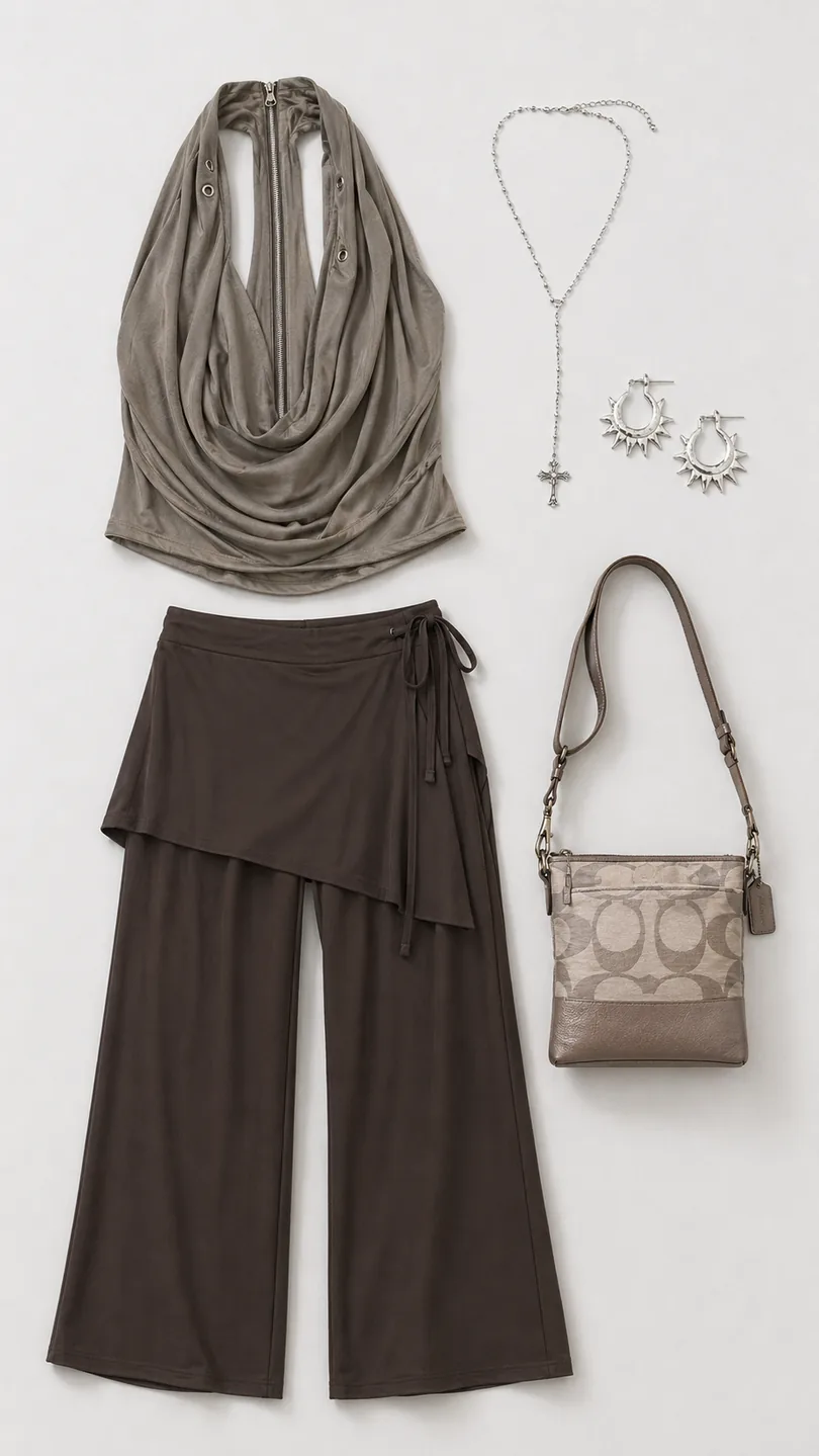 A dark zipper top with cross jewelry, sun hoops, skirt trousers, and a Coach bag for a very serious late-night noodle run. The pieces are Jaded London Vrax Cowl Zipper Top, Bohomoon UO Exclusive Lillie Cross Lariat Necklace, Hammered Sun Hoop Earrings and Motel Amata Dark Brown Skirt Trouser, with the smaller extras kept visible instead of buried.