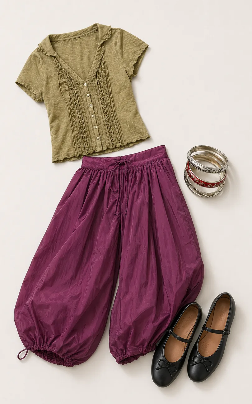 Parachute pants meet a frill shirt, red bangles, and black ballet shoes for hiding in plain sight. The pieces are Cloud Parachute Pants, Jenny Frill Shirt, Red & Etched Bangles 3-Pack and RAID Black Eiline Ballerina Shoes, with the smaller extras kept visible instead of buried.