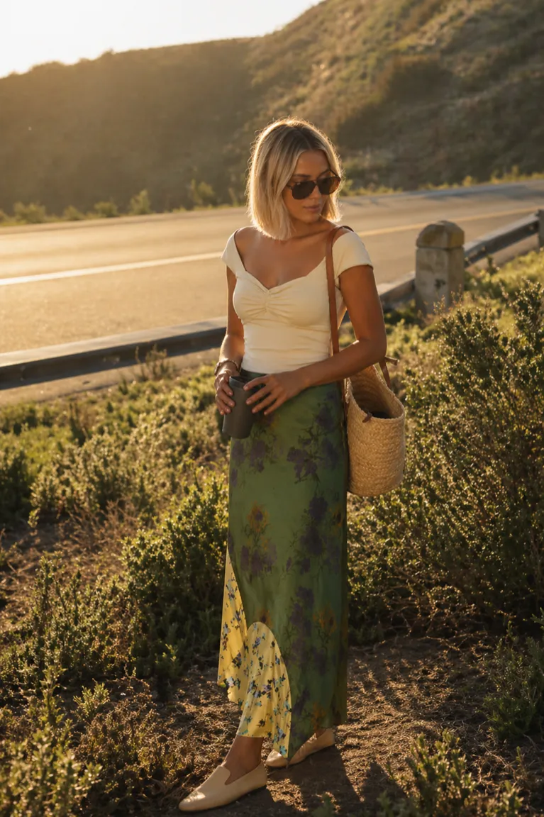 Soft off-shoulder top paired with a flowing floral skirt and minimal flats creates a relaxed, sunlit vacation style—capturing natural movement and effortless elegance by golden hour.
