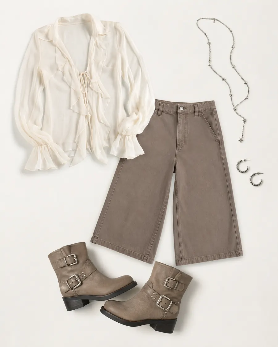 A Selena blouse brings the soft texture, balanced with a mini bottom, flat shoes, and a bag that still feels ready for the street.