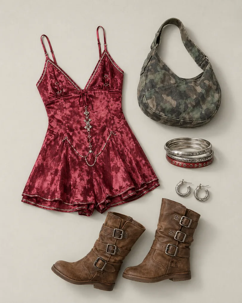 A skort romper with buckle boots, a camo sling bag, red bangles, and tiny hoops for sprinting between stages. The pieces are Light Before Dark Eli Skort Romper, Taupe Tales Buckle Boots, Penny Camo Sling Bag and Red & Etched Bangles 3-Pack, with the smaller extras kept visible instead of buried.