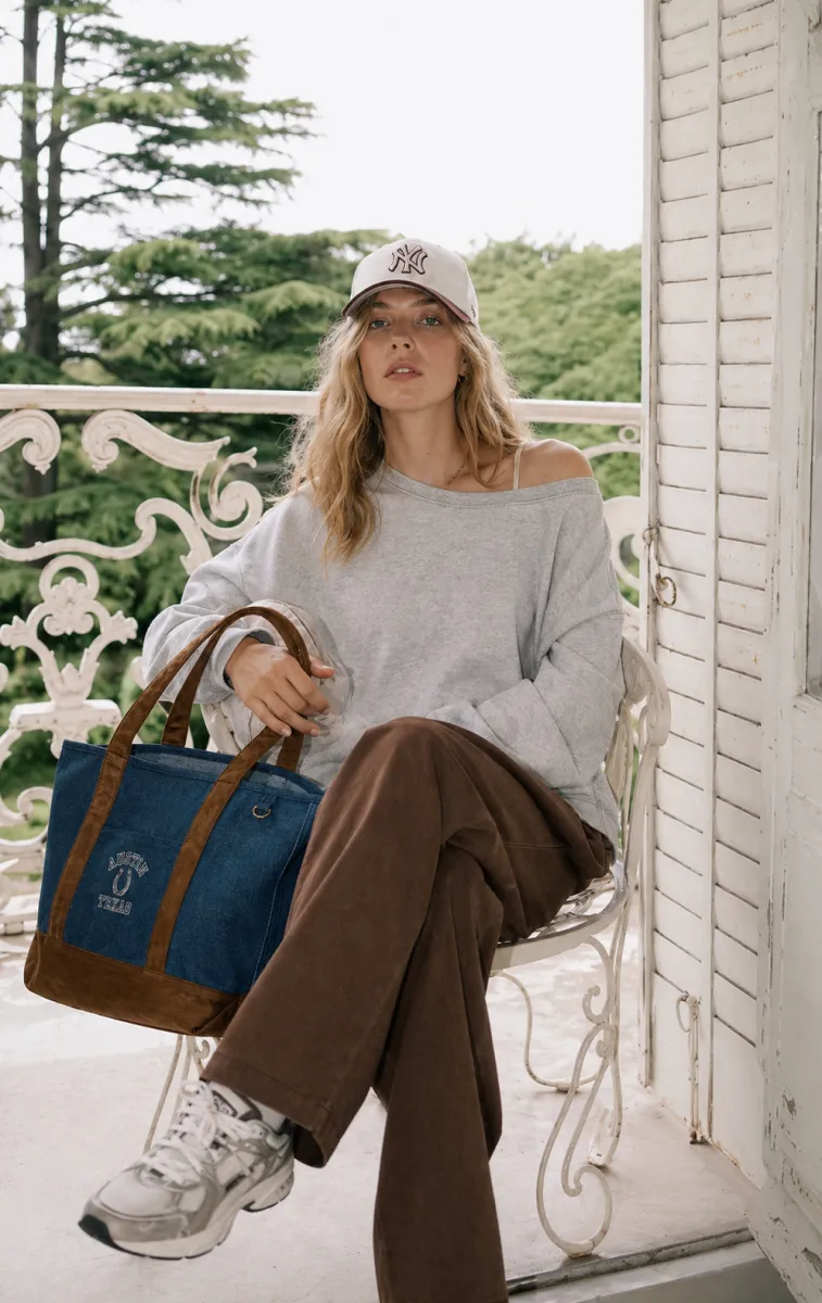 A slouchy grey off-the-shoulder sweatshirt paired with warm brown super low-rise flare pants. A western tote and New York Yankees hat complete this relaxed spring look.