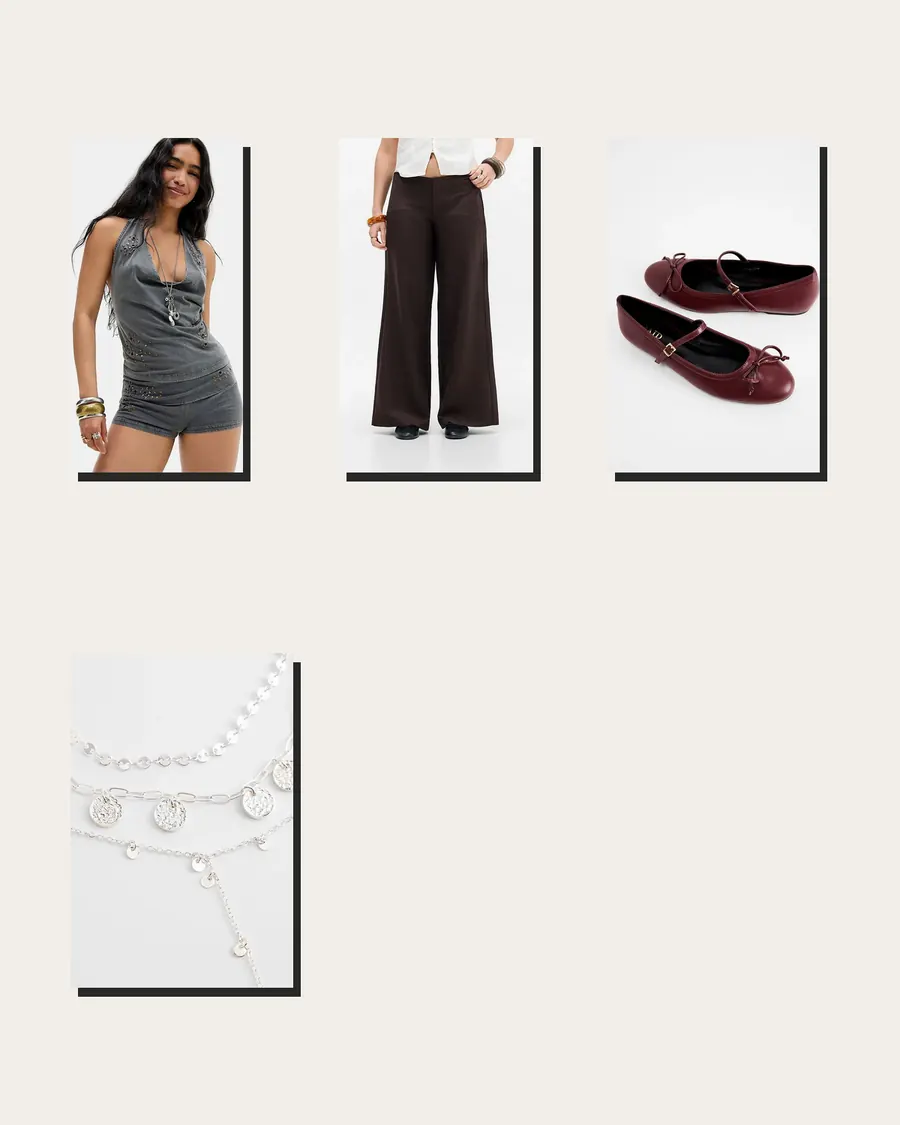A studded halter, low-rise trousers, ballet shoes, and a circle necklace make a clean door-list outfit with just enough shine.