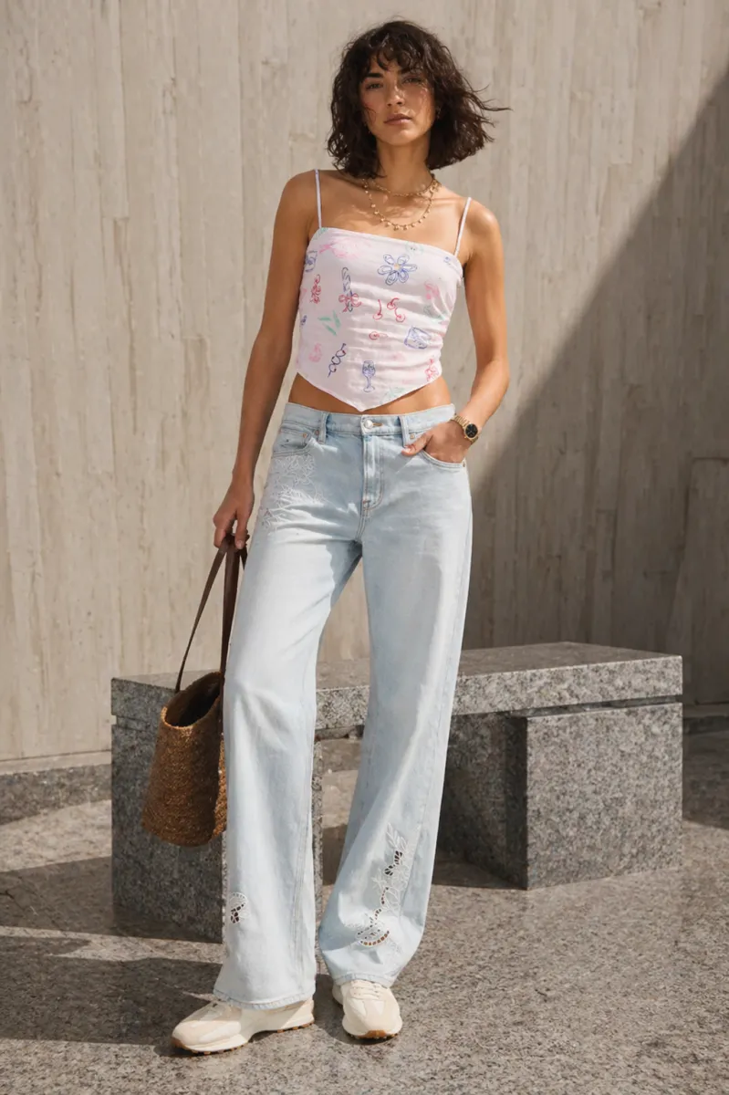 A linen-blend bandana top and high-waisted embroidered floral jeans for a fresh summer feel. New Balance 327 sneakers and a Nixon watch complete this relaxed coastal look.